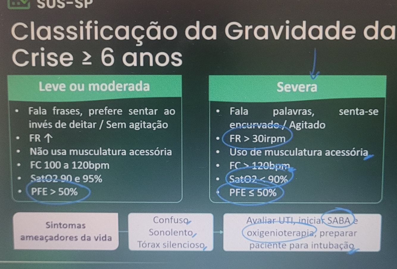 A classificação da crise asmática é dividida entre leve ou mederada e em severa para >ou = 6 anos. Escreva os potnos considerados em uma crise SEVERA
