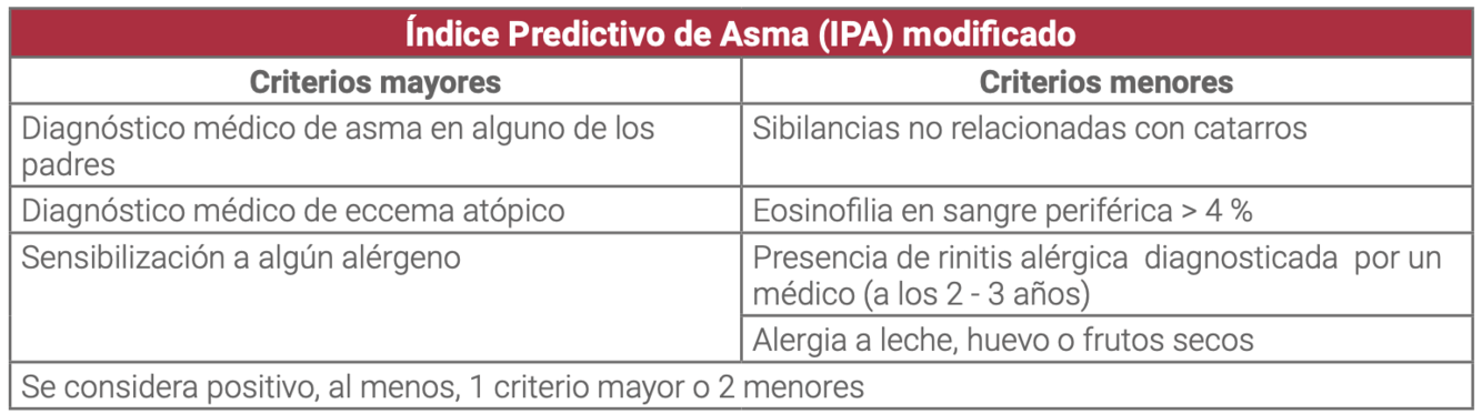 Los criterios menores incluyen sibilancias no relacionadas con catarros, eosinofilia en sangre periférica mayor al 4%, presencia de rinitis alérgica diagnosticada por un médico y alergia a leche, huevo o frutos secos. Este índice es útil y sencillo de realizar, validado y con una buena razón de verosimilitud positiva.