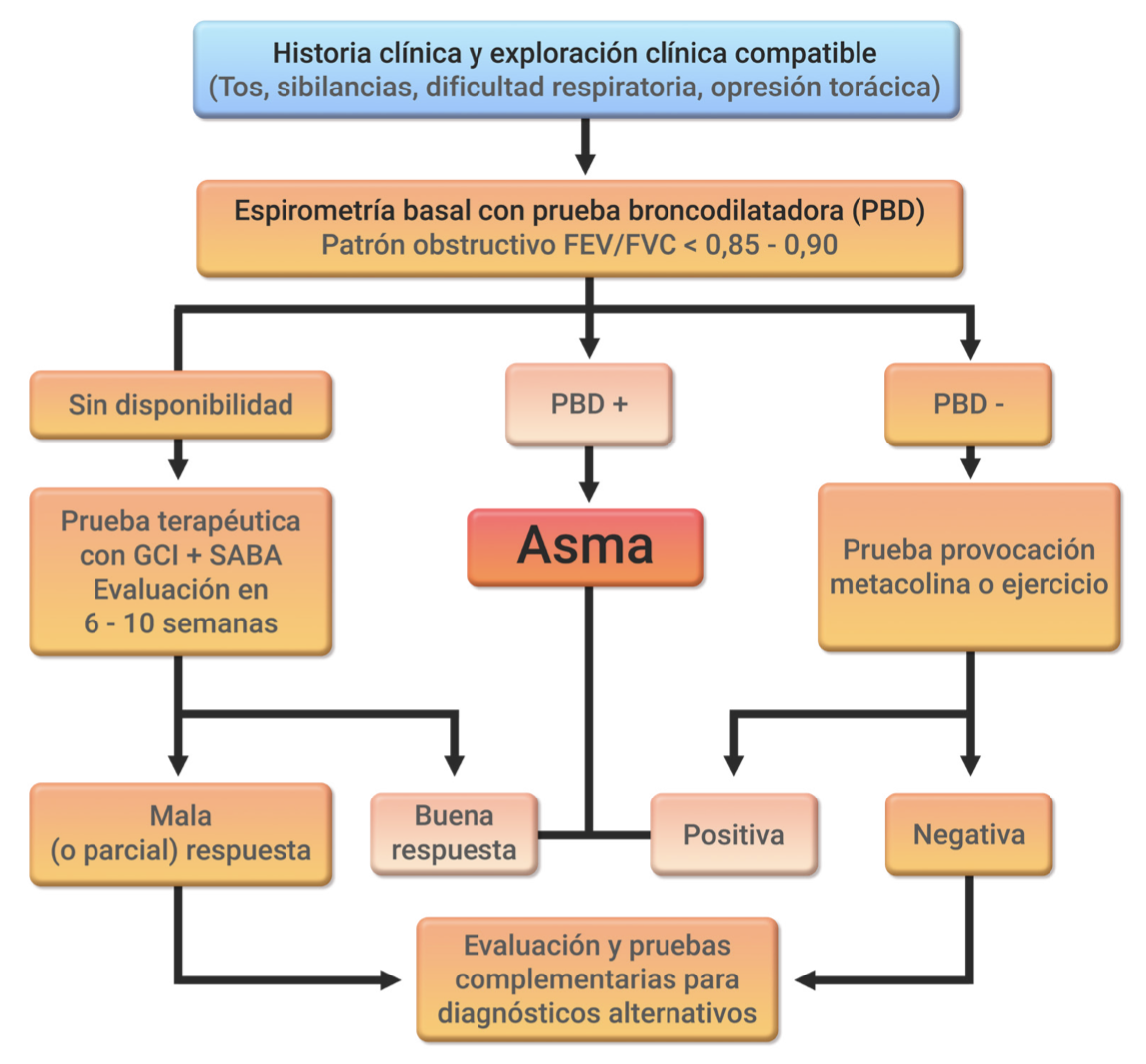 En pediatría, el diagnóstico del asma bronquial es esencialmente clínico y se basa en la identificación de antecedentes clínicos y síntomas respiratorios episódicos, así como la limitación variable del flujo aéreo que puede ser confirmada con pruebas de función pulmonar, como la espirometría con evaluación de la respuesta broncodilatadora.