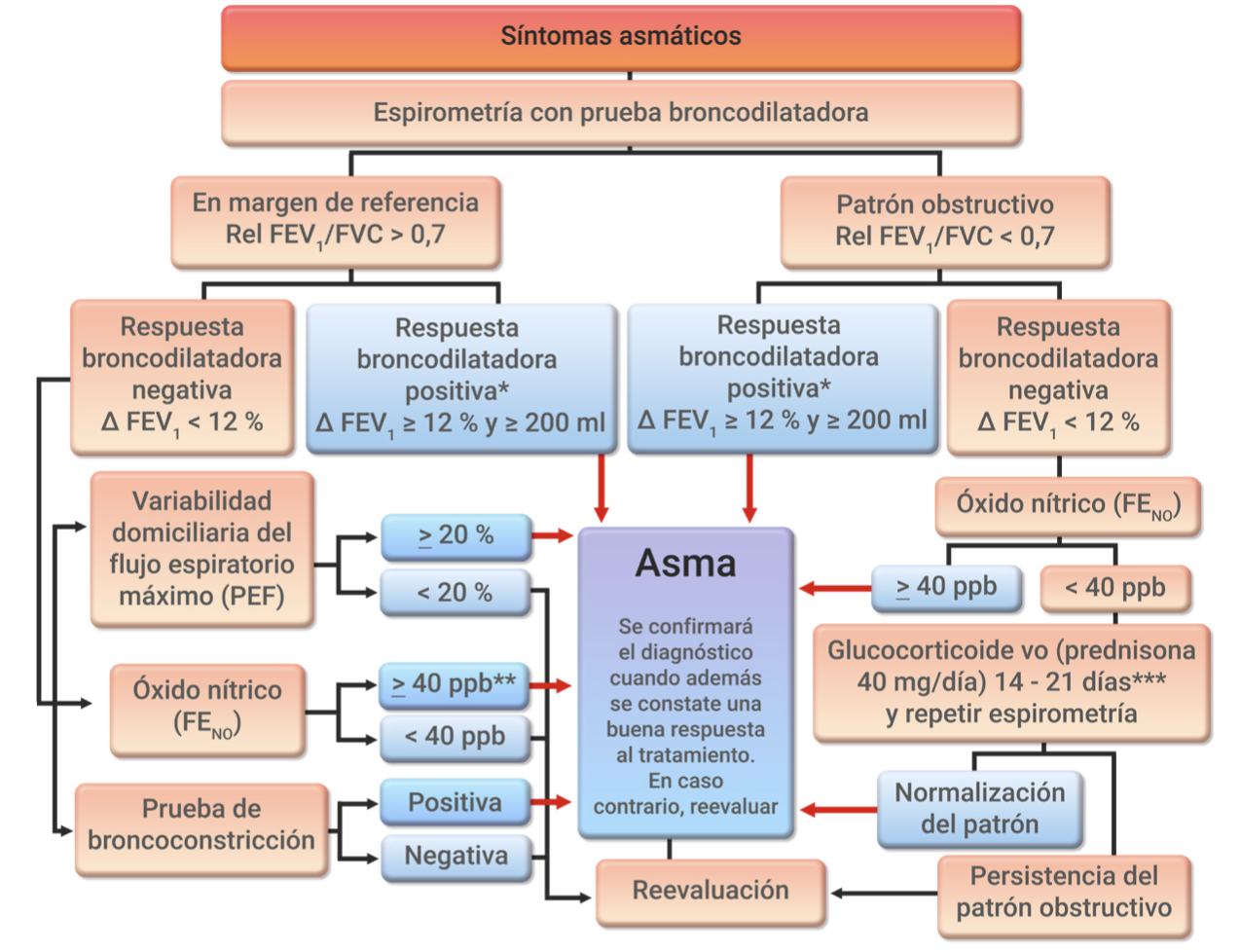 Además, la reversibilidad puede ser identificada por una mejora del FEV1 o PEF después de 2 semanas de tratamiento con glucocorticoides sistémicos o 2-8 semanas con glucocorticoides inhalados. Aunque la reversibilidad es característica del asma, no todos los pacientes asmáticos la presentan.