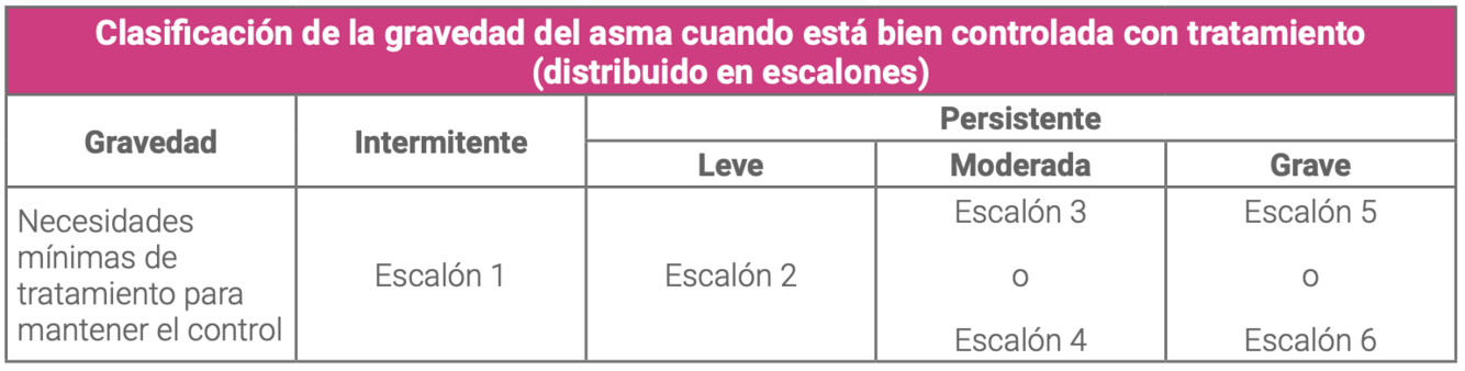 Clasificación de la gravedad del asma cuando está bien controlada con tratamiento (distribuido en escalones)?