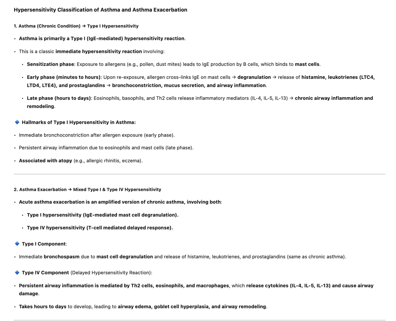 Asthma is mediated by IgE against environmental antigens, leading to mast cell degranulation, eosinophilic inflammation, and bronchoconstriction.