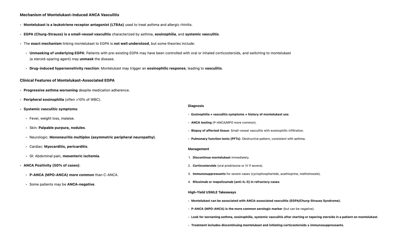 Montelukast and zafirlukast. Montelukast can be associated with ANCA-associated vasculitis (EGPA/Churg-Strauss Syndrome, eosinophilic granulomatosis with polyangiitis), P-ANCA (MPO-ANCA). In general, asmatics are at increased risk for developing P-ANCA-associated vasculitides, particularly Eosinophilic Granulomatosis with Polyangiitis (EGPA, formerly Churg-Strauss Syndrome), even without taking montelukast. Treatment of EGPA includes corticosteroids and immunosuppressants (e.g., cyclophosphamide, rituximab, mepolizumab in refractory cases). Churg-Strauss syndrome is characterized by perivascular eosinophilic inflammatory infiltrates and presents with asthmatic symptoms and pulmonary infiltrates. It is also typically accompanied by allergic rhinitis, sinusitis, nasal polyps, and skin lesions. Additionally, patients may also experience mononeuropathy multiplex is a condition characterized by damage to multiple, isolated peripheral nerves, resulting in weakness, numbness, tingling, and pain in various parts of the body.