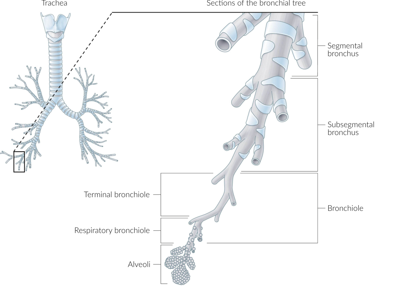 The symptoms of asthma are primarily caused by inflammation of the terminal bronchioles. Terminal bronchioles are lined with smooth muscle but lack the cartilage found in larger airways. When an allergen triggers a hypersensitivity reaction there is bronchial submucosal edema and smooth muscle contraction and the airways collapse, as they don’t have the support of cartilage. This collapse leads to the symptoms of asthma.