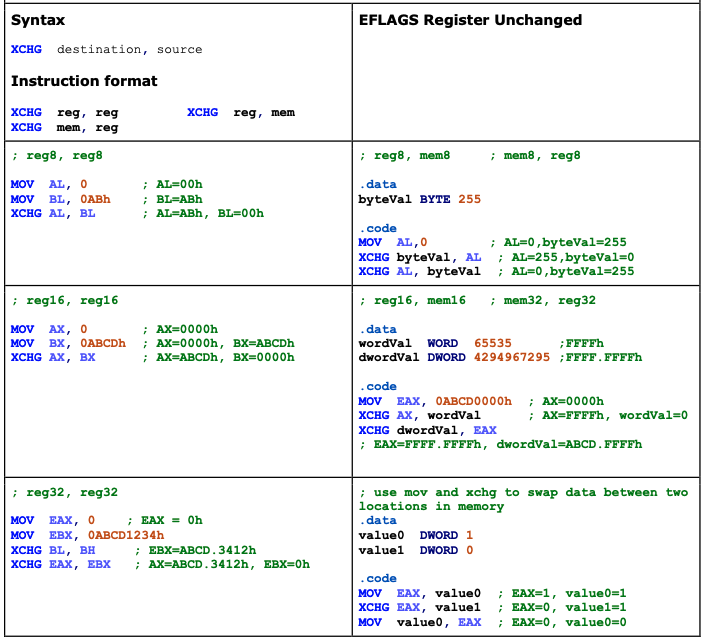 Exchanges data values in the source and destination operands. The contents can be exchanged