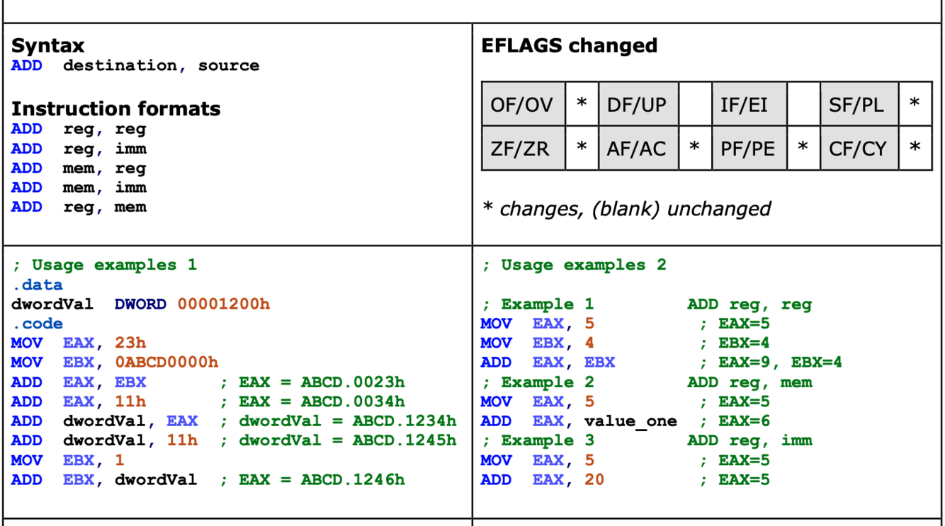 Adds the source operand to the destination operand; can be used to add either signed and unsigned integers.