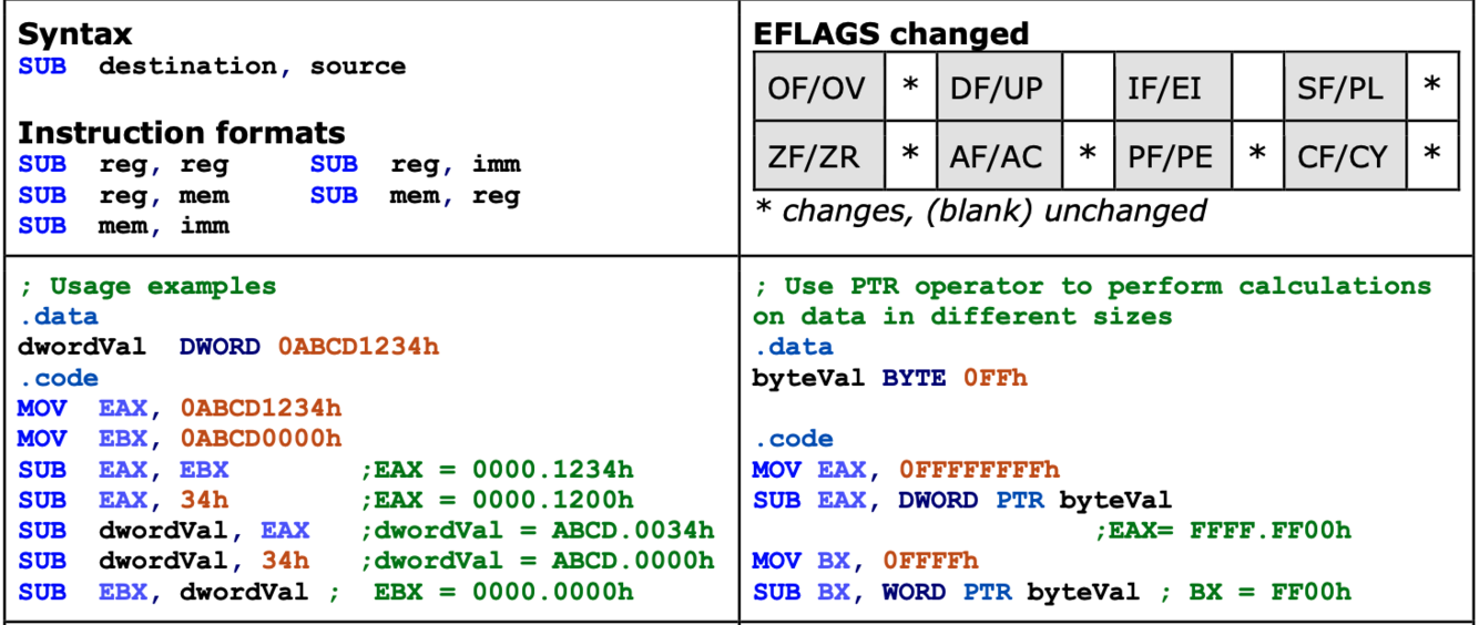 Subtracts the source operand from the destination operand; can be used to subtract both signed and unsigned integers.