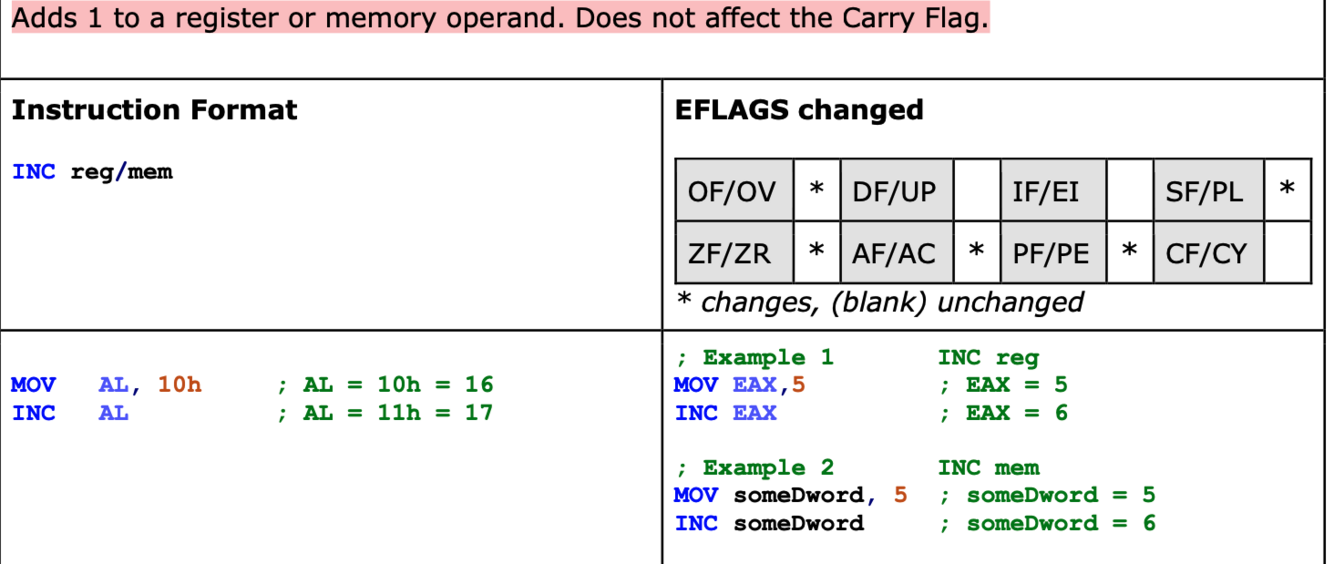Adds 1 to a register or memory operand. Does not affect the Carry Flag.