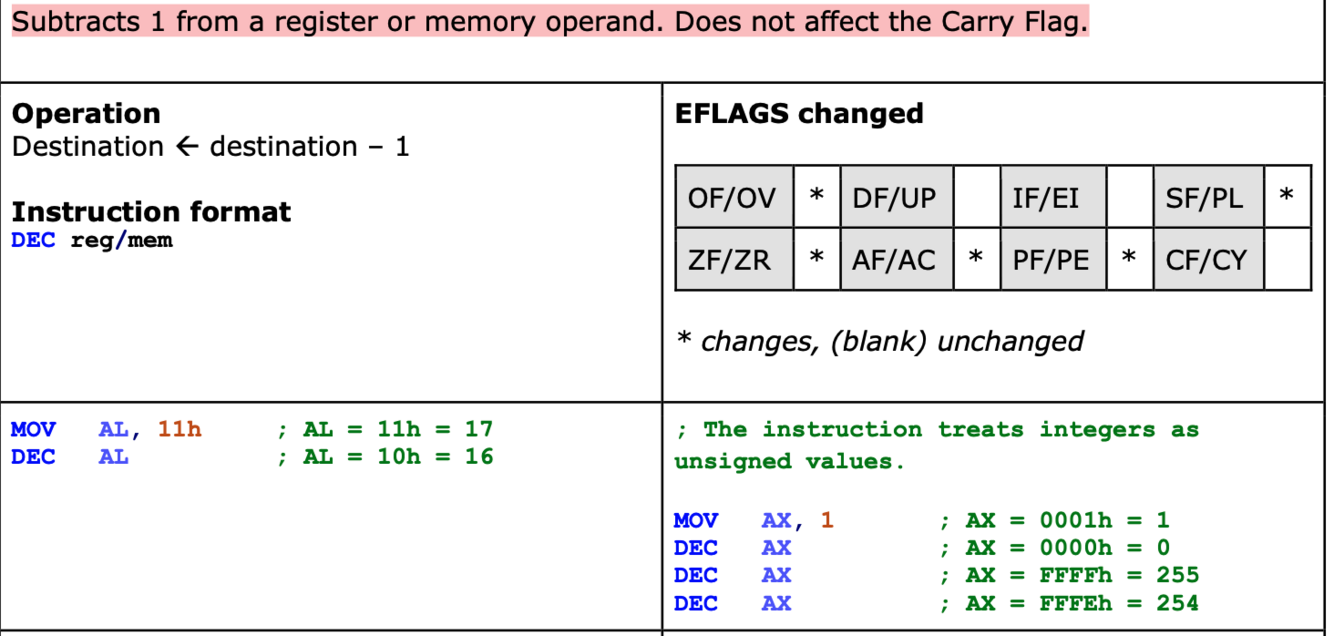 Subtracts 1 from a register or memory operand. Does not affect the Carry Flag.