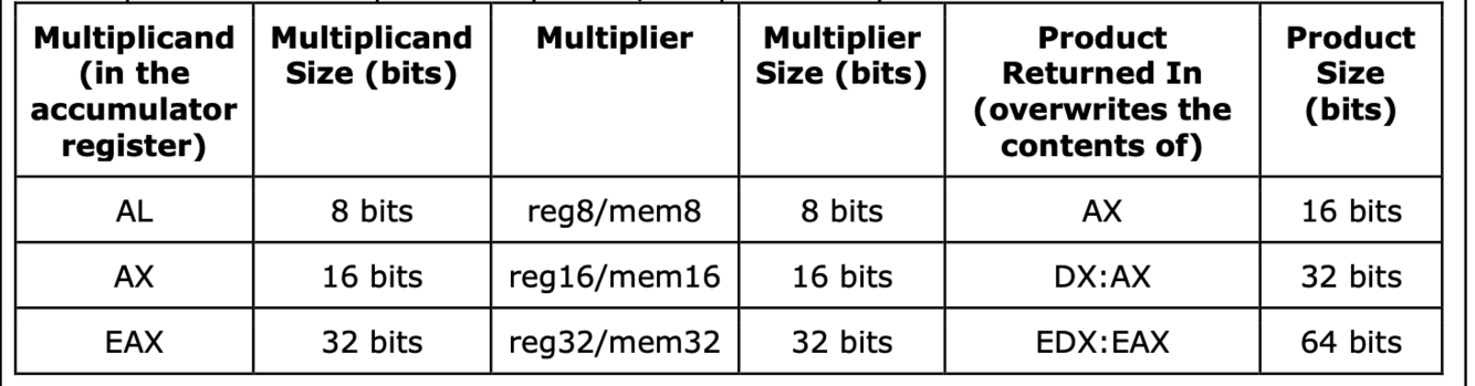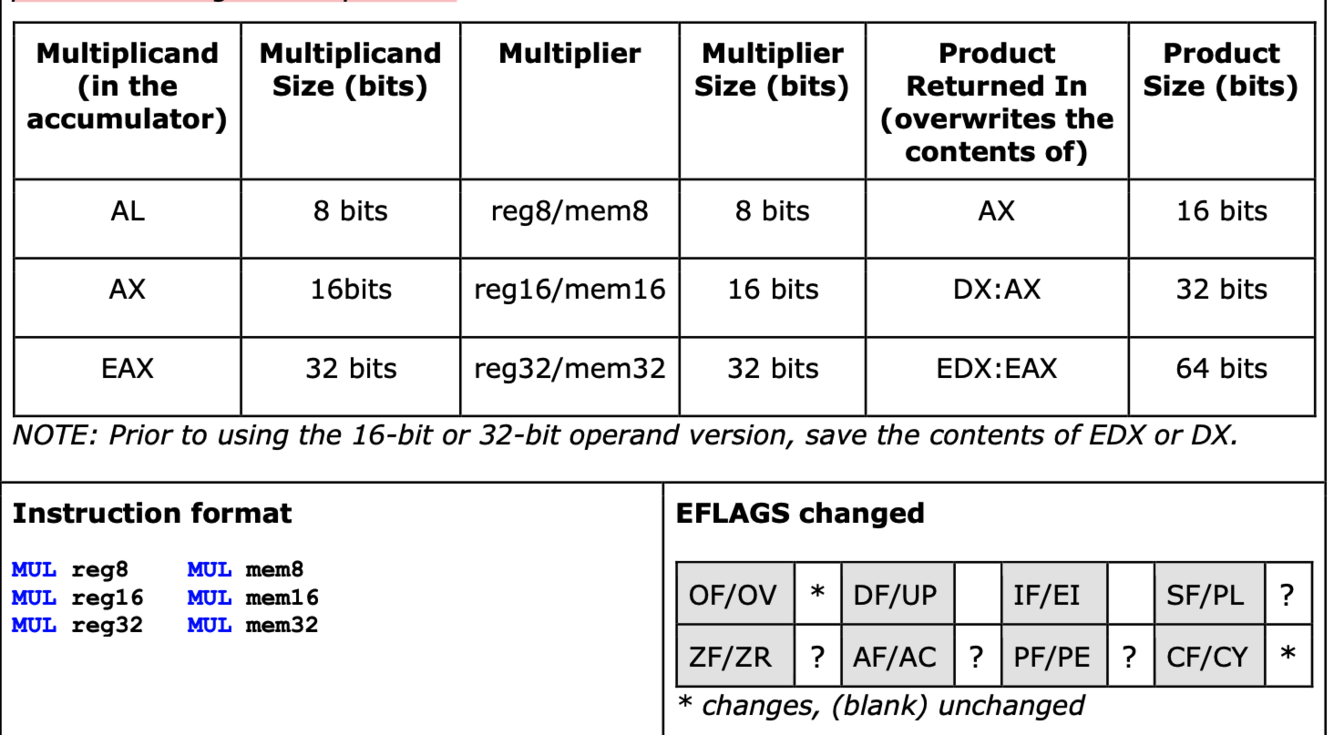 Behaves as the MUL instruction. The multiplicand and the destination are implied. The multiplier