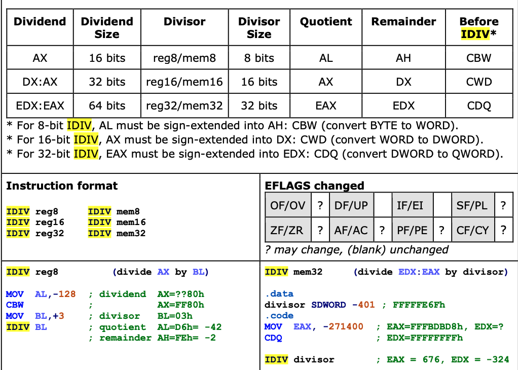 Carries out 8-bit, 16-bit, and 32-bit signed integer division. Returns a quotient and a