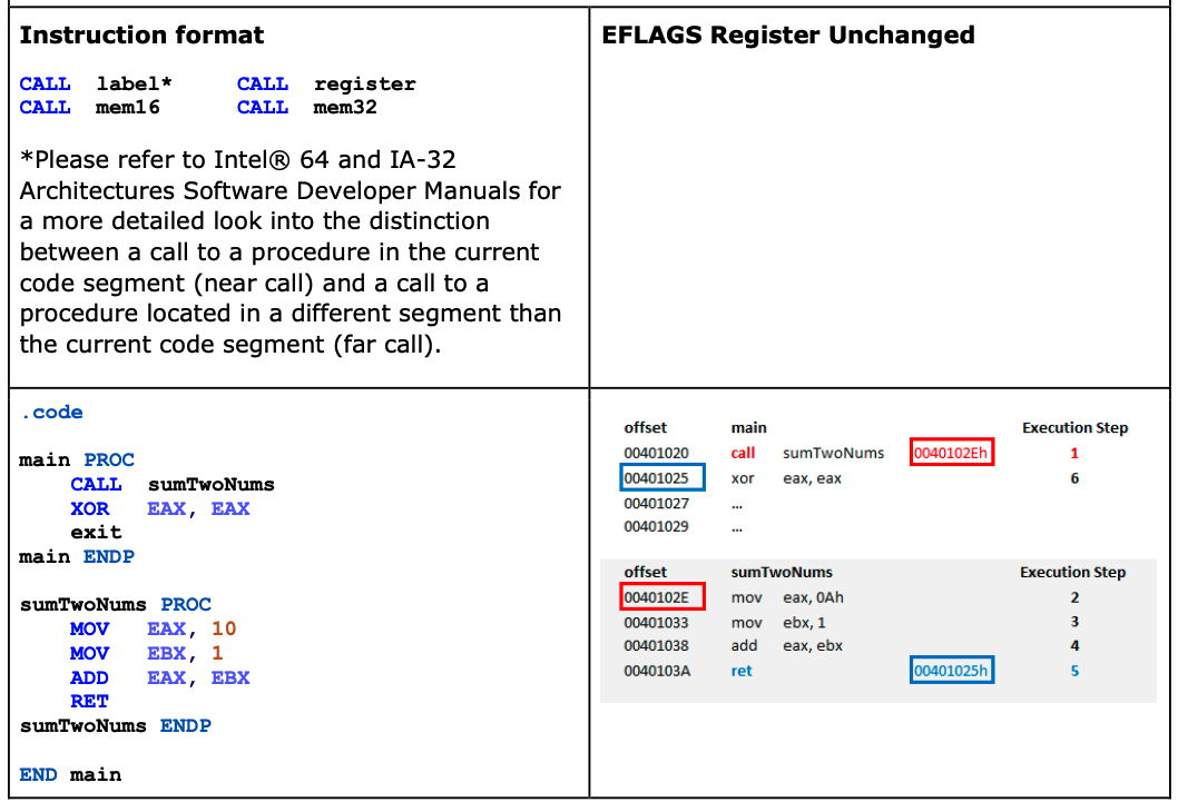 (2) loads the offset of the called procedure into the EIP register (called procedure address).