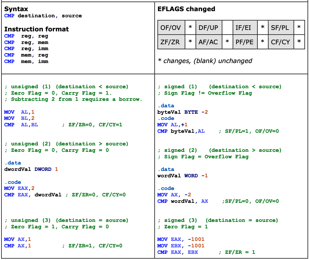 Compares the destination operand to source operand by performing implied subtraction of the
