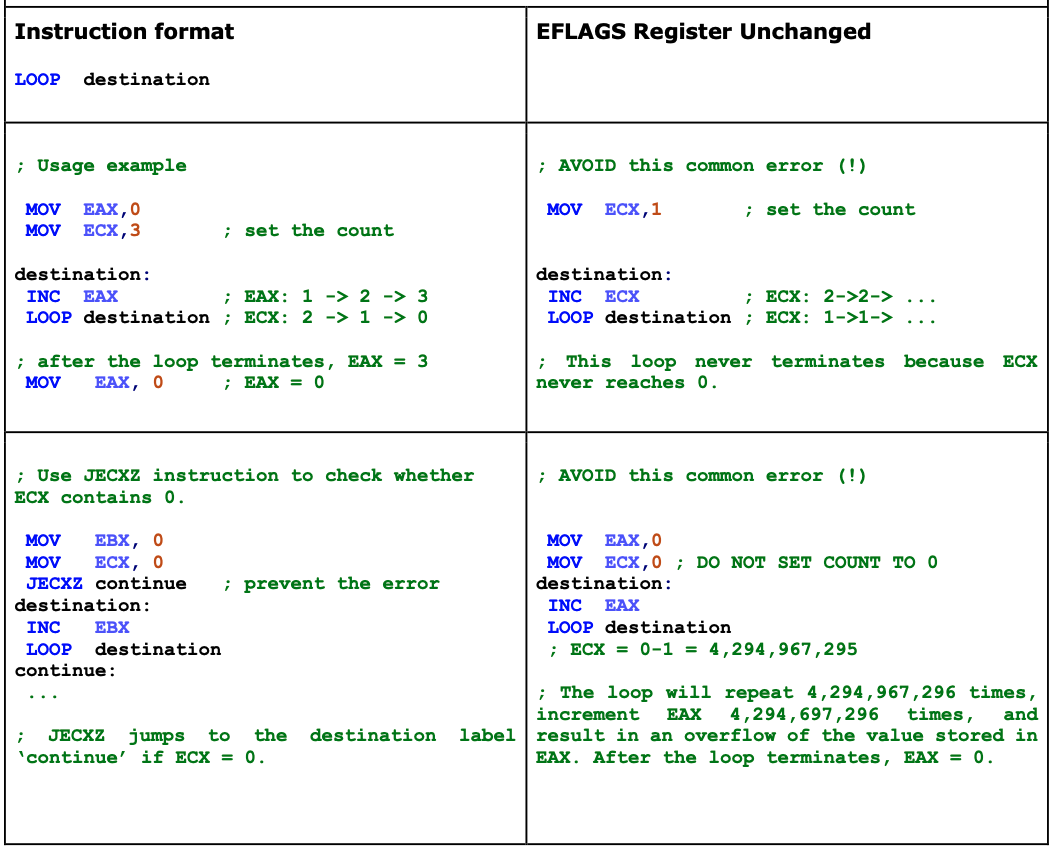 Decrements ECX by 1, then checks ECX for 0. If ECX equals 0, the loop terminates, and the