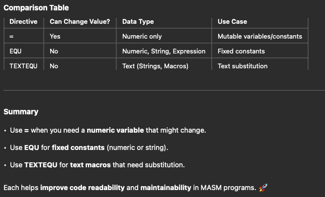 EQU is used to define a constant or label. Unlike =, the value cannot be changed once defined. Can hold numbers, strings, or expressions