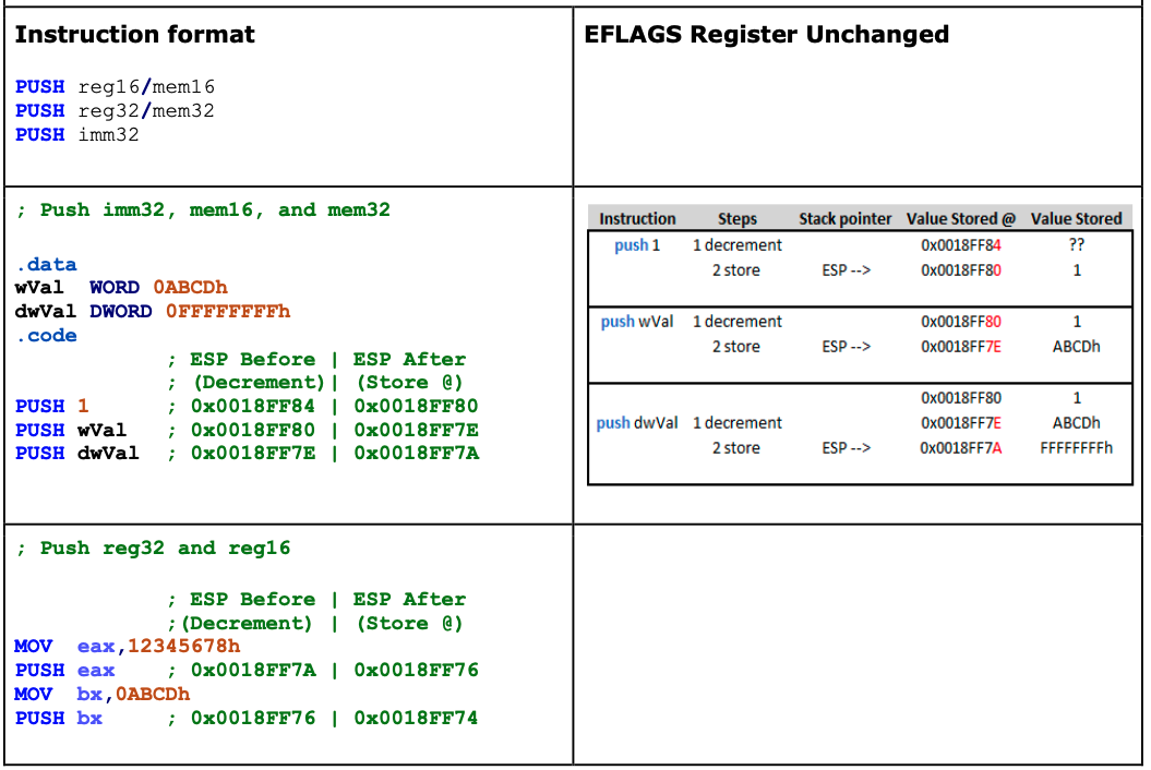 operand decrements the offset stored in the ESP register by 4. Pushing a WORD register or