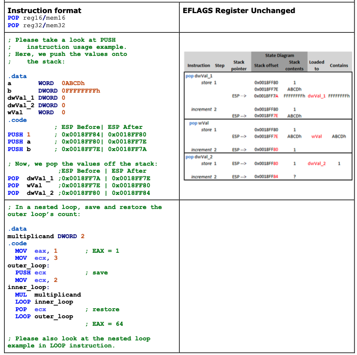 destination operand. Then increments the value of ESP. If the destination operand is 16 bits, POP