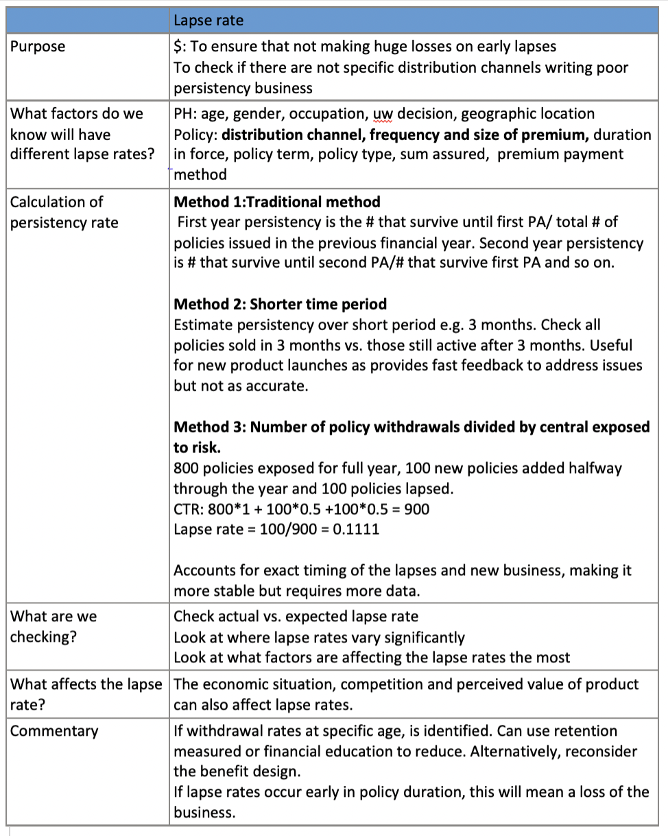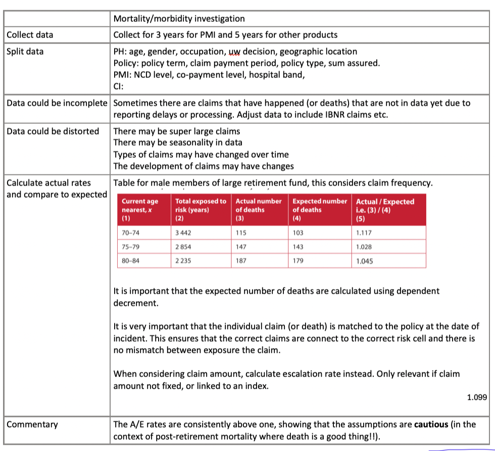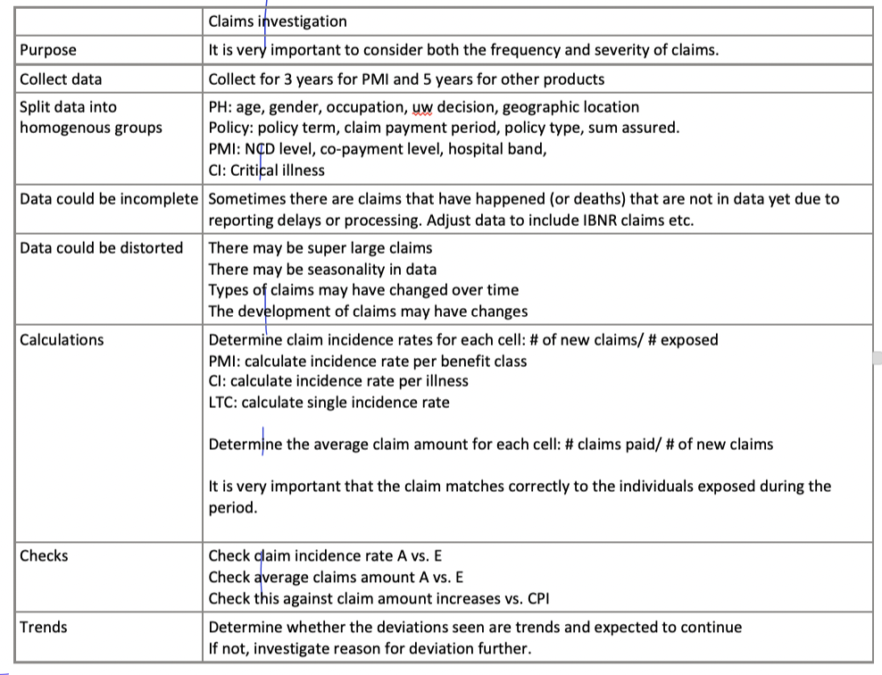 Mortality and morbidity, claim incidence, claim amount, lapse and renewal