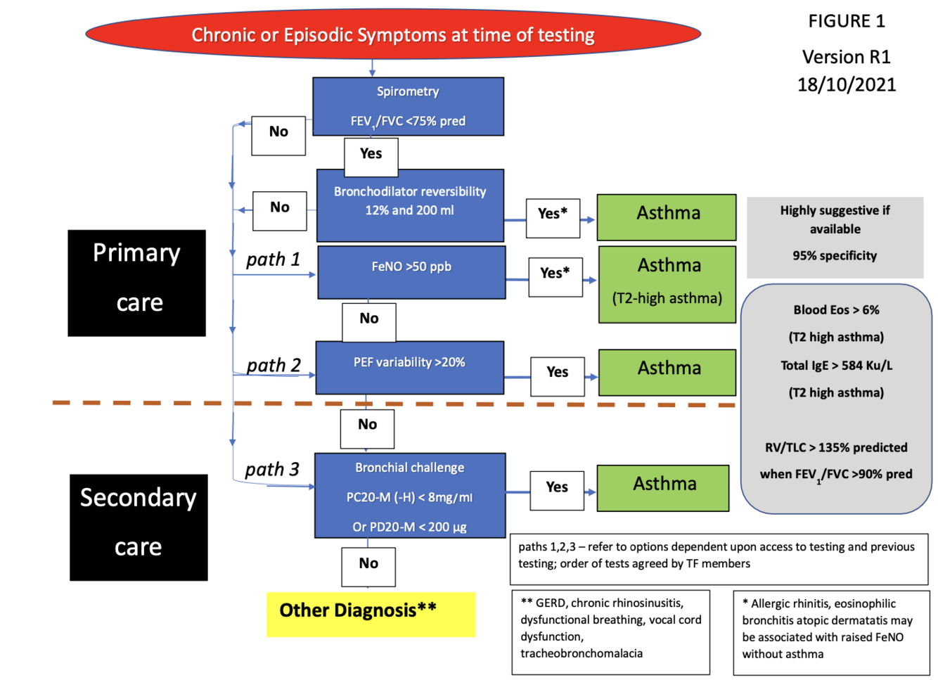 - FEV1/FVC <LLN or <75%, should be considered supportive of an asthma diagnosis and should prompt reversibility test