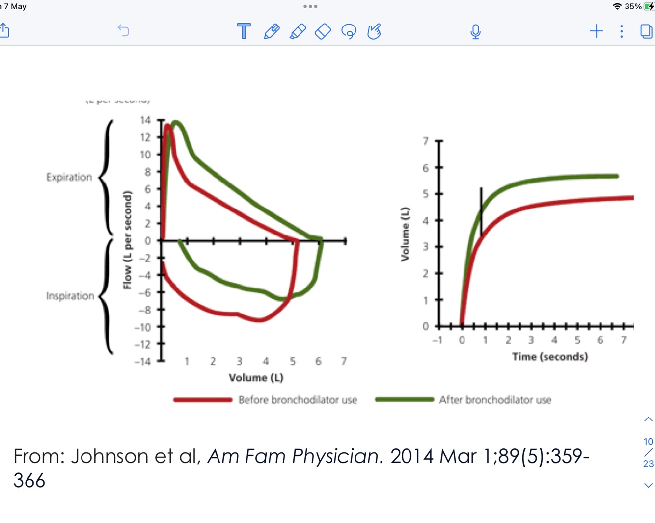 The doctor suspects that John might have asthma. He carries out spirometry before and after an inhaled bronchodilator to determine between asthma and COPD.