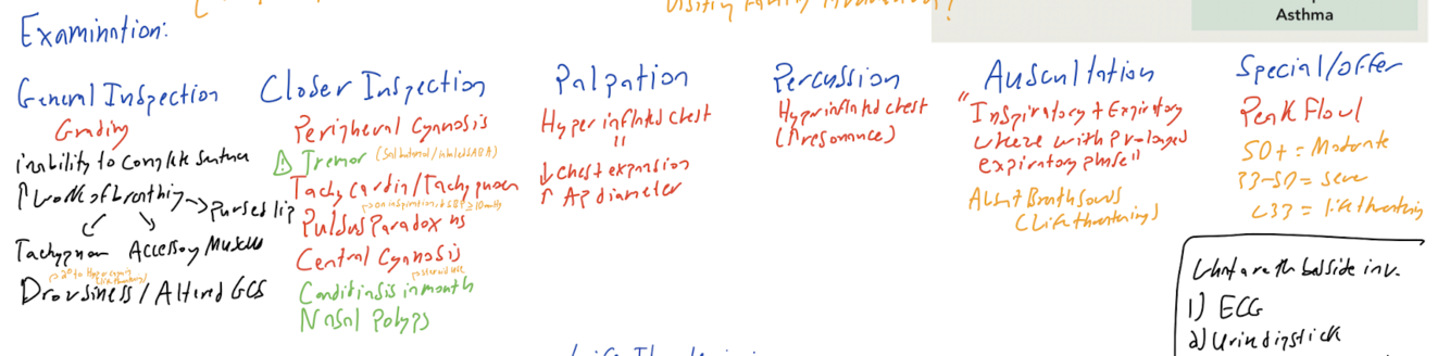 What examination findings would you expect in a patient with an asthma exacerbation?