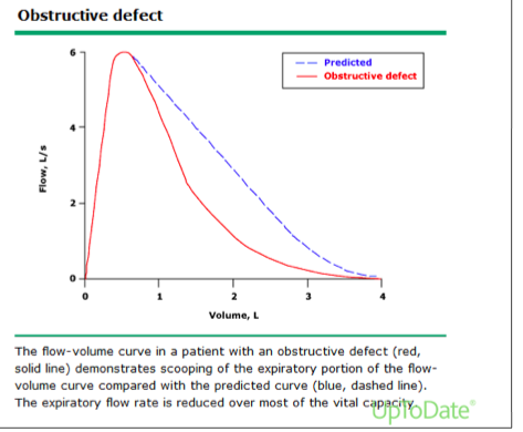 Obstructive defect demonstrates scooping of the expiratory portion of the flow-volume curve compared with the predicted curve. The expiratory flow rate is reduced over most of the vital capacity.