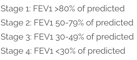 The severity of the airflow obstruction in COPD can be graded using the FEV1: