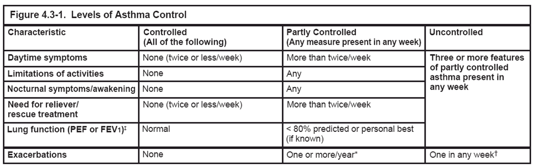 GINA guidelines for levels of asthma control