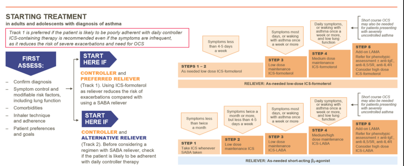 On peut considérer une réduction de l’intensité de traitement d’entretien quand l’asthme est bien contrôlé et le contrôle maintenu pour 3 mois. L’objectif est trouver le traitement minimal permettant un contrôle des symptômes et des exacerbations tout en minimisant les effets indésirable