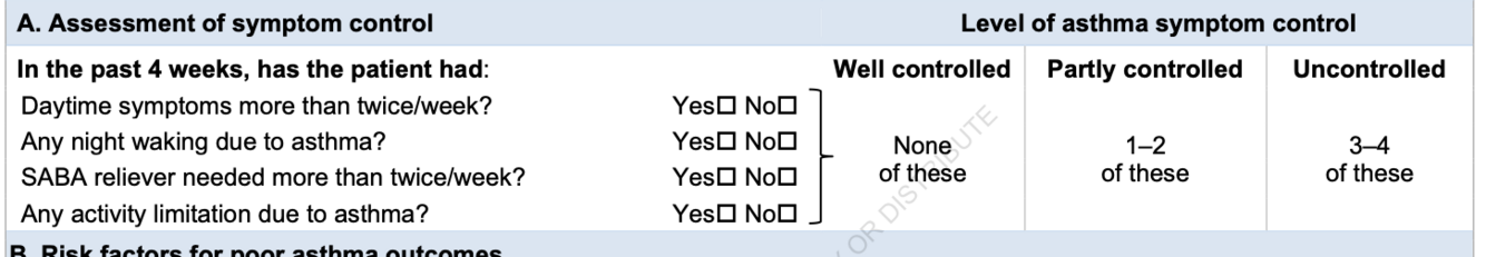 La sévérité de l’asthme n’est pas quelque chose de statique mais peut varier au fil des mois et des années. La sévérité de l’asthme est différent du contrôle de l’asthme, l’évaluation de la sévérité de l’asthme se fait de façon rétrospective en évaluant le niveau de médication nécessaire au bon contrôle de l’asthme et à la prévention des exacerbations. Un asthme léger est asthme contrôlé par un tritement d’étape 1 ou 2. Un asthme sévère est un asthme nécessitant un traitement d’étape 5.