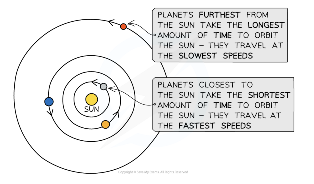 The further away a planet is from the Sun, the slower it travels and therefore the longer it takes to orbit