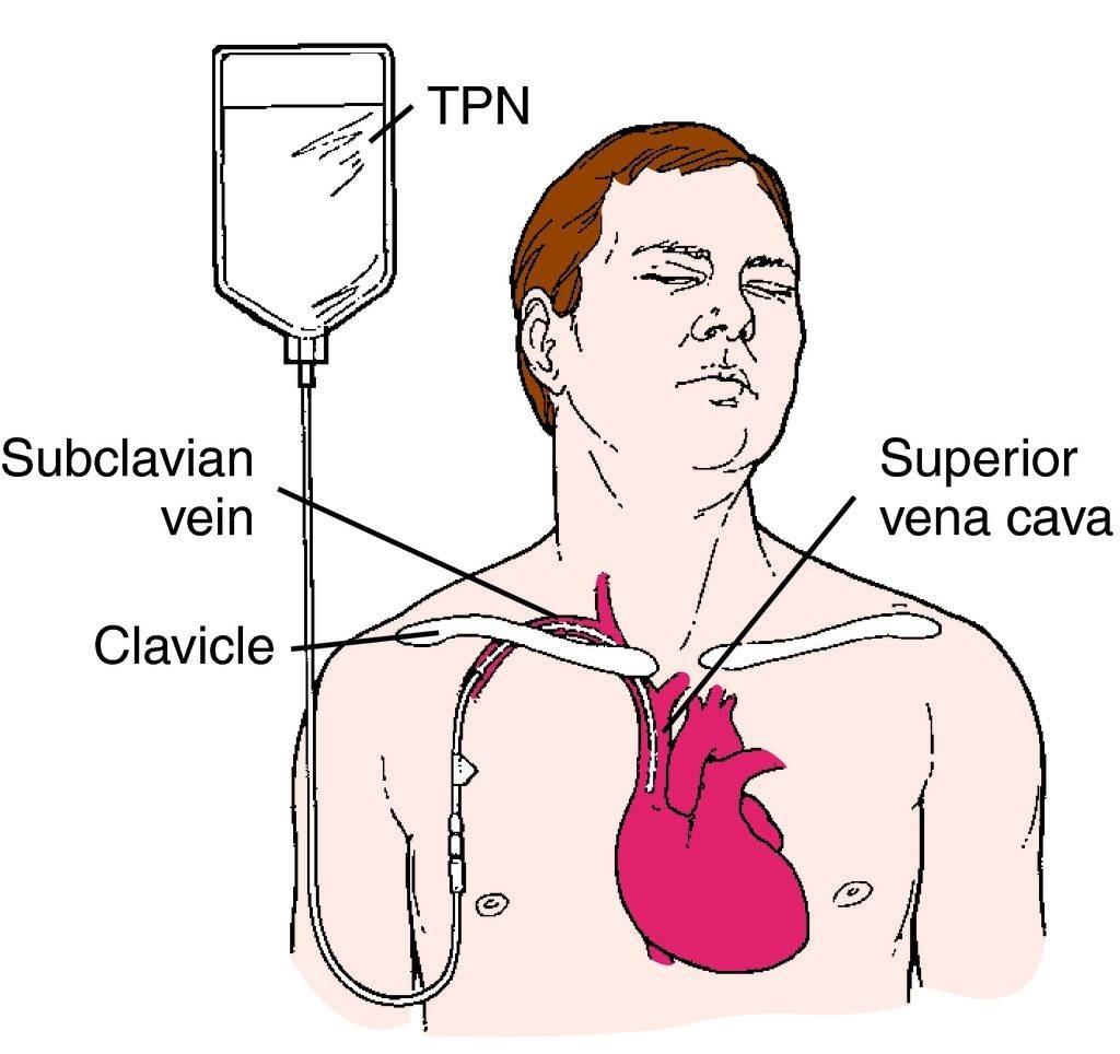 Placed in a large vein that goes directly to the heart called a central venous catheter