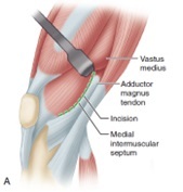 -ATRAVÉS DA FASCIA MEDIAL DO VASTO E DISSECÇÃO ROMBA NA BORDA MEDIAL DO VASTO MEDIAL (POSTERIOR AO SEPTO INTERMUSCULAR MEDIAL)