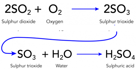 Then, the sulfur trioxide reacts with the water vapour in the atmosphere to form sulfuric acid.