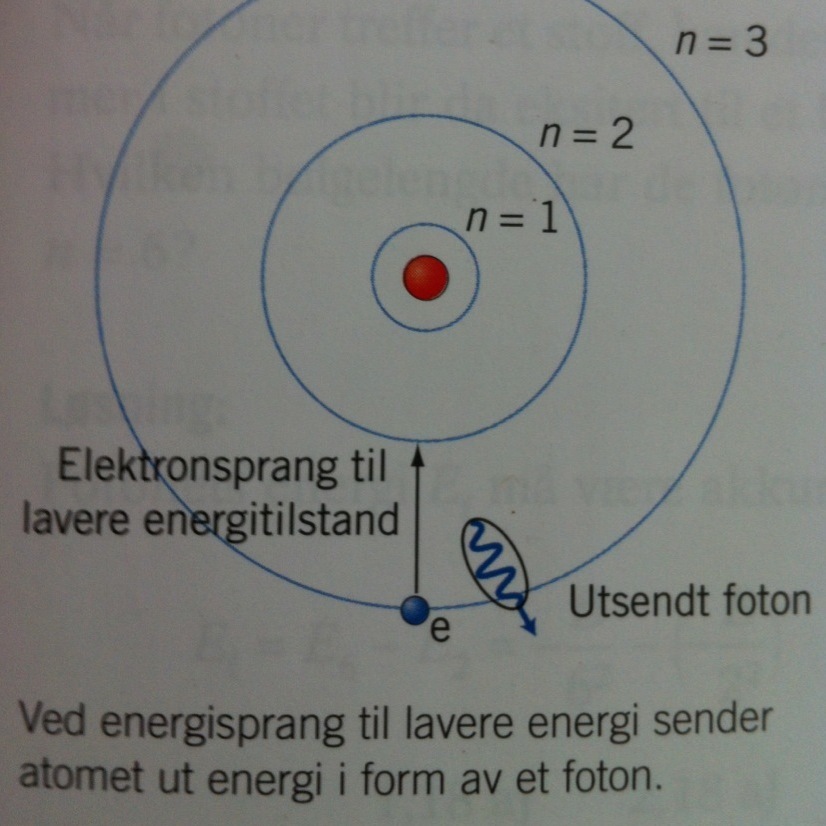 Hvis et atom går fra en energitilstand til en annen som har lavere energi, blir hele energiforskjellen sendt ut som ett enkelt foton