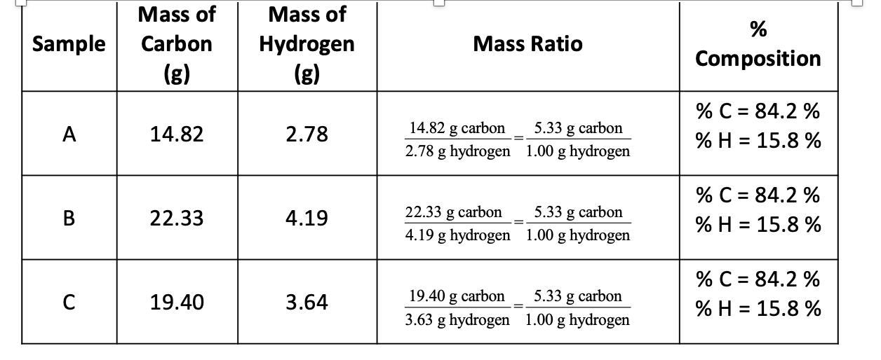 when two elements react to form more than one compound, a fixed mass of one element will react with masses of the other element in a ratio of small, whole numbers