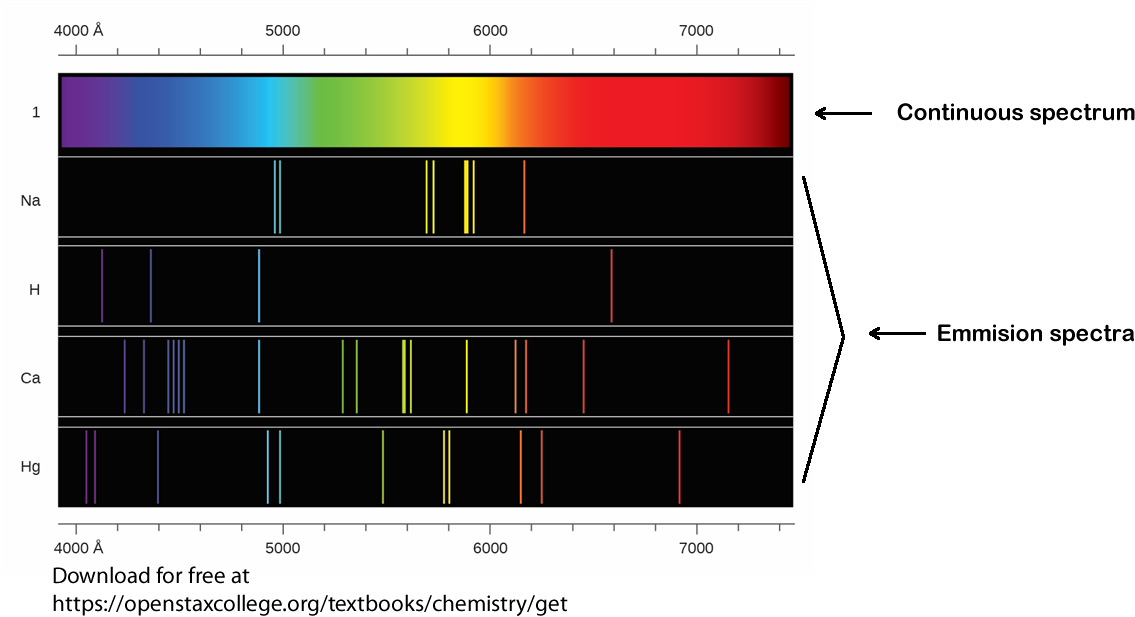 Discrete lines at designated wavelengths (in the UV, visible and/or IR) which result from electrons “falling” from higher to lower energy levels. Each element will have its own emission spectrum, which a reflection of the energy difference between excited states and ground state. By contrast, a continuous spectrum shows a continuous set of “lines” at all wavelengths.