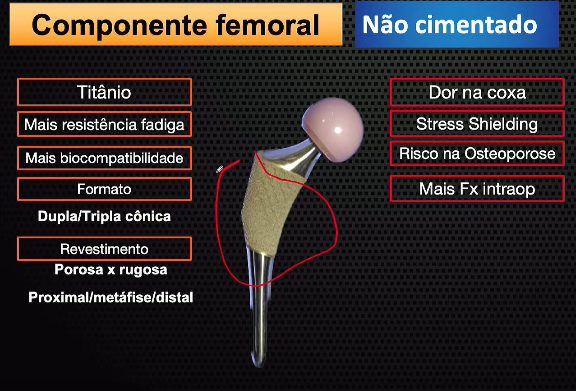 Componente femoral não cimentado - características técnicas e material ideal, vantagens e desvantagens