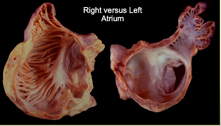 Left atrium has a smooth surface and lacks the architecture that is present in the right atrium