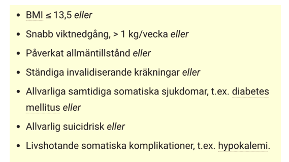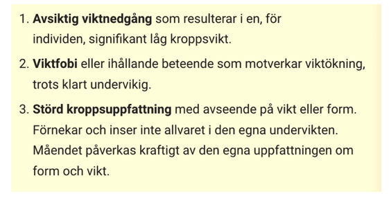 Anorexia nervosa - Tillstånd med förvrängd självbild där patienten upplever sig själv som överviktig trots att vikten är under det normala. Diagnoskriterierna utgår från avsiktlig viktnedgång (under normalgräns), viktfobi och störd kroppsuppfattning.
