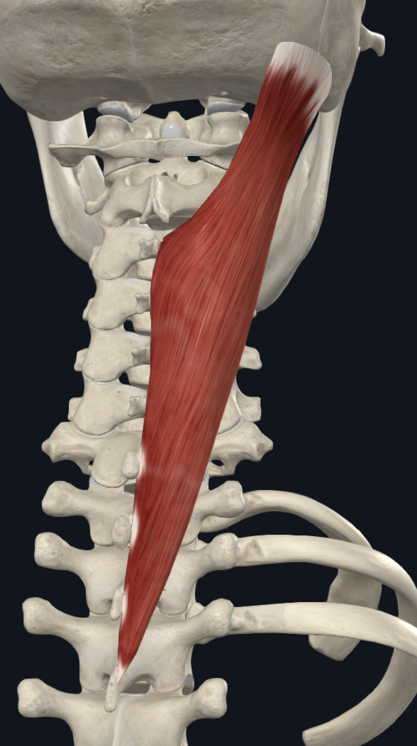 Origin: 1/3 of superior nuchal line, external occipital, SPs C2-T12, nuchal ligament
