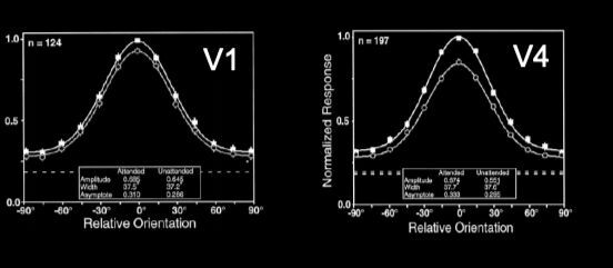 → attention effects: attention manipulation in very early stages – enhances neural responses to attended stimuli, attenuates responses to ignored stimuli, and increases baseline activity in the absence of visual stimulation.