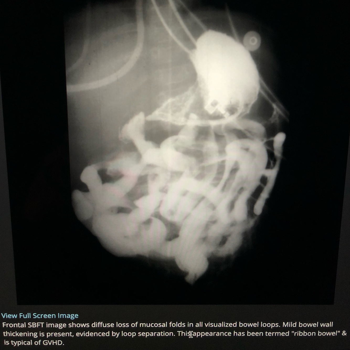Marked luminal narrowing of small bowel results in ‘ribbon like’ appearance on enterography