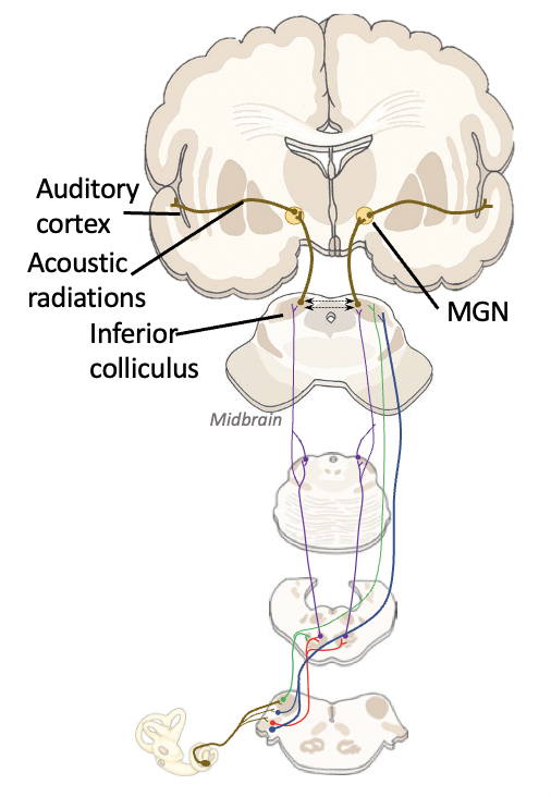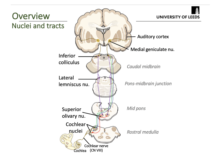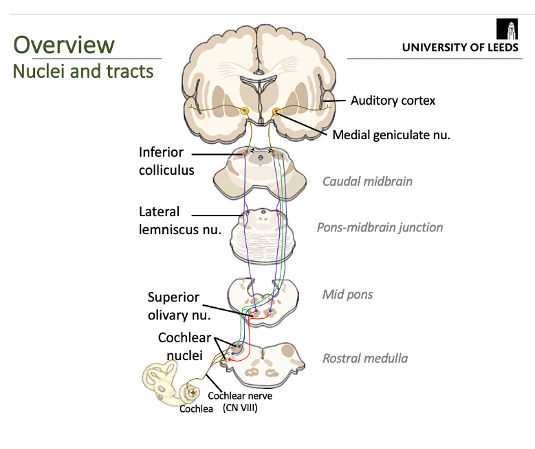 In brief, what are all of the structures involved in the auditory pathway and where are they located?