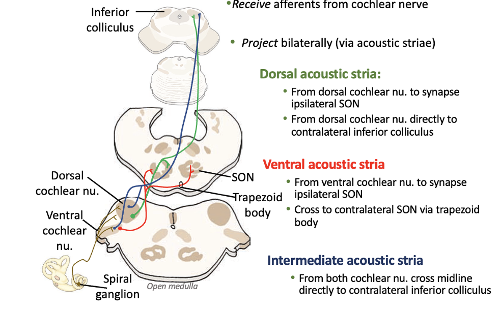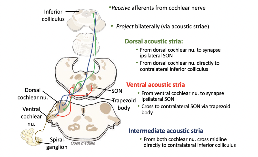 Where does the dorsal acoustic stria originate from?