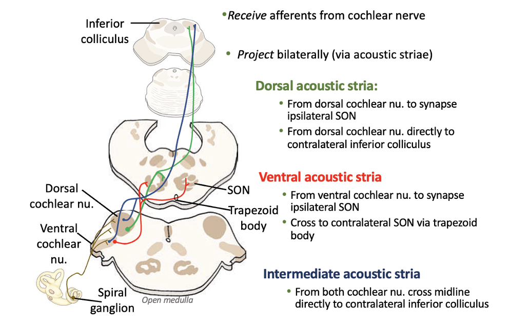 What are the projections originating from the cochlear nuclei?
