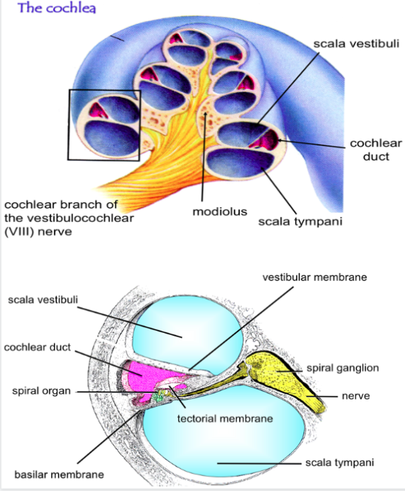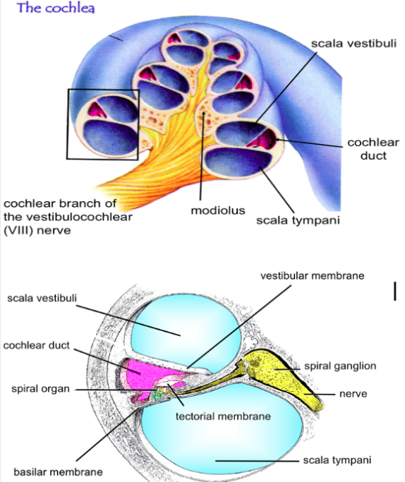 The cochlea is the auditory part of the ear with 3 compartments. Describe these…