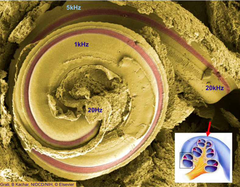 High pitched sound is more energetic, so more damaging to hair cells. As we age, we lose High frequency hearing for this reason= Presbyacusis