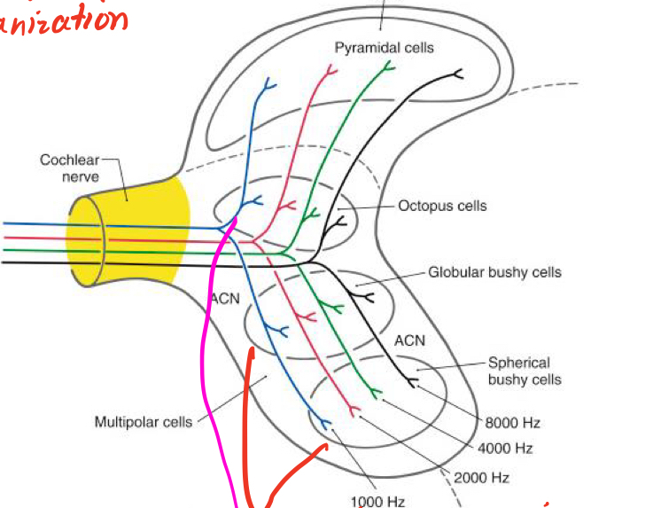 Primary afferents from cochlear portion of CN VIII travel to the dorsal cochlear nucleus where they will synapse