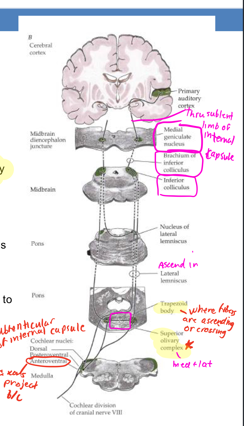Axons project BILATERALLY by passing thru the trapezoid body to the superior olivary complex (pons)